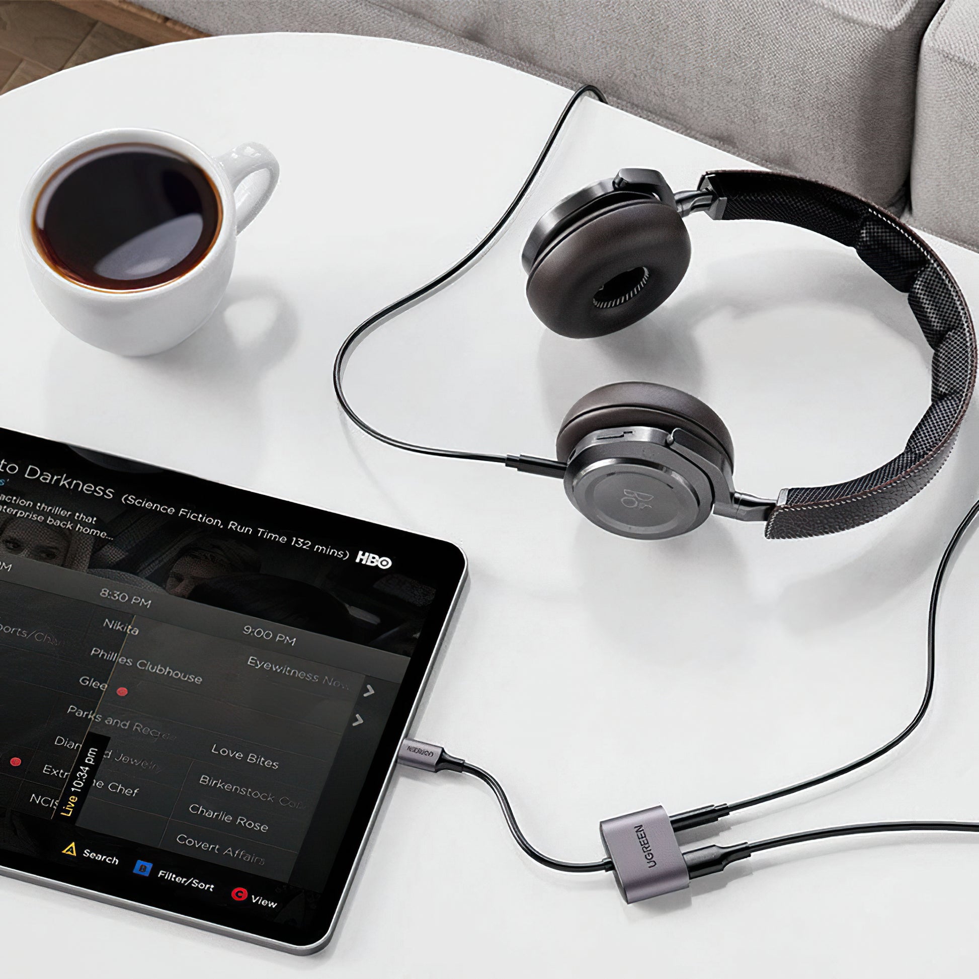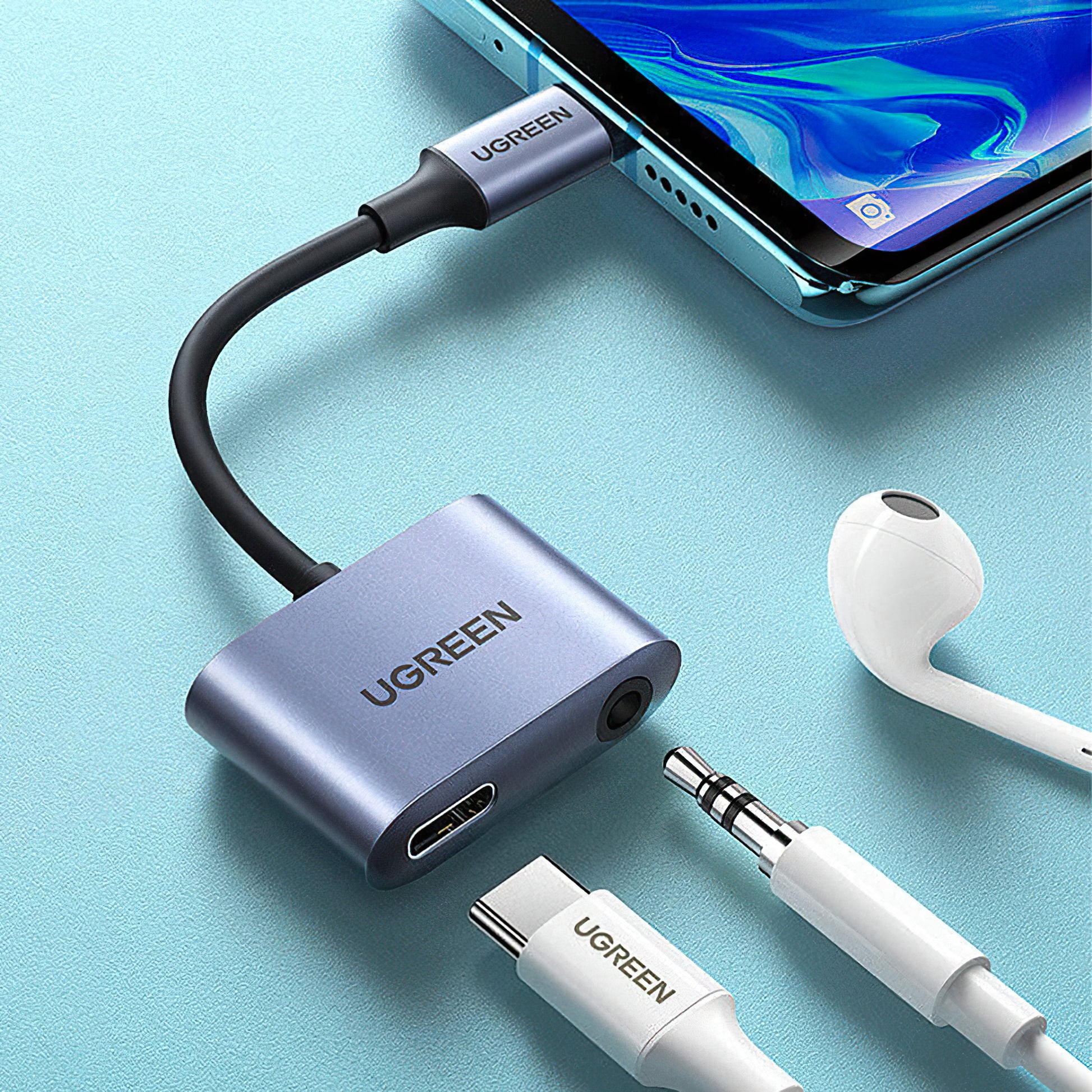 Adaptorul audio USB-C la 3.5mm / USB-C UGREEN CM231 iti permite sa asculti muzica si sa incarci telefonul simultan.