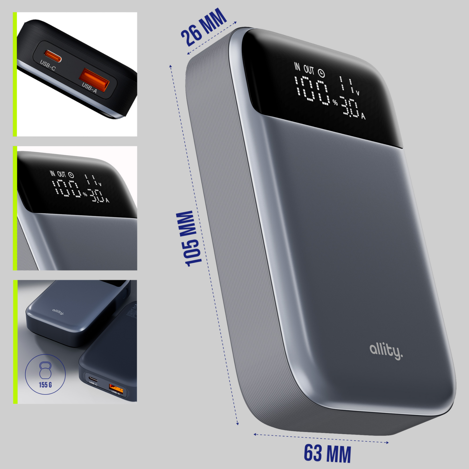 Baterie Externa Allity. APB-200 PocketPower, 10000mAh, 33W, QC + PD, 1 x USB-A - 1 x USB-C, Gri