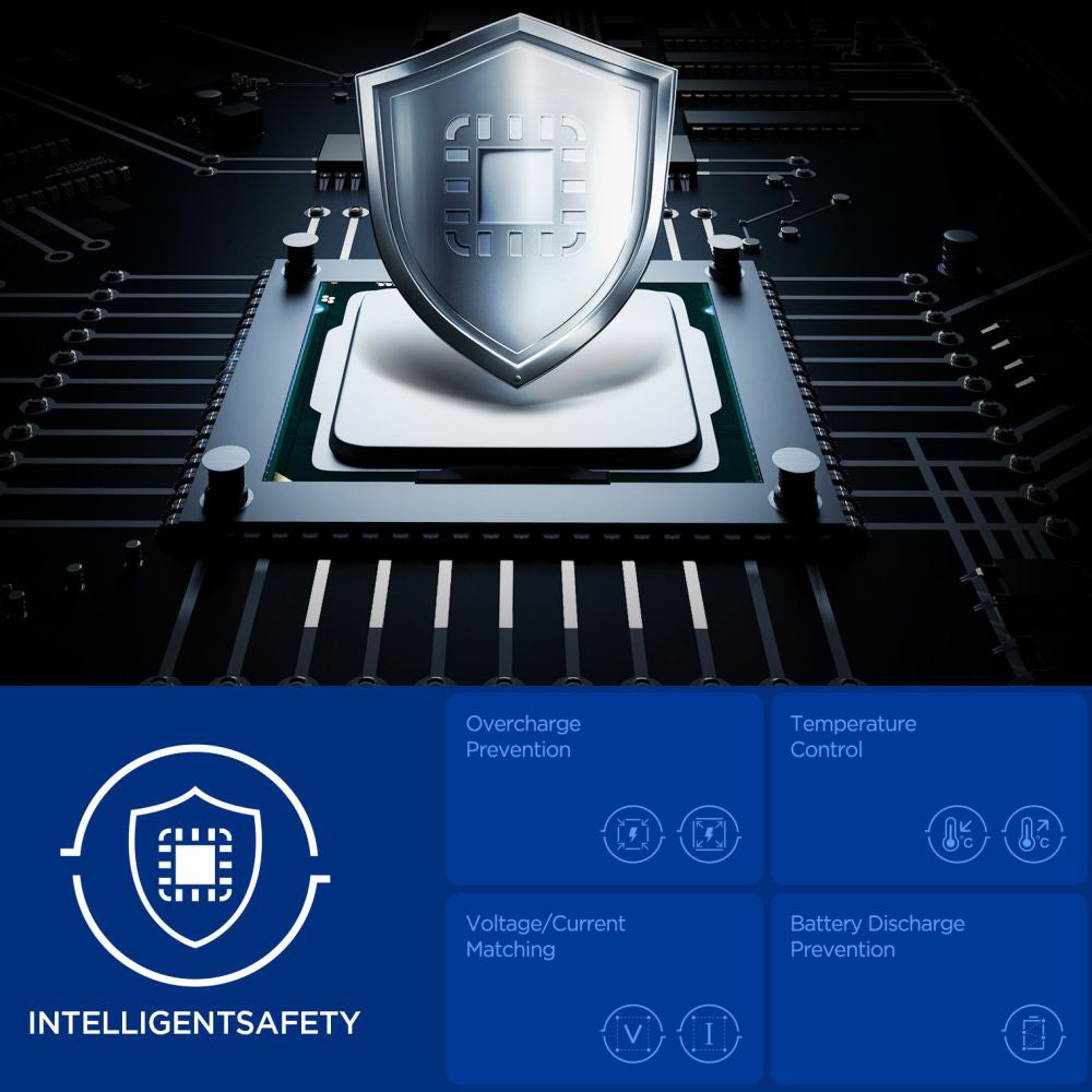 Sistemul IntelligentSafety asigura protectie completa prin prevenirea supraincarcarii, controlul temperaturii si protejarea bateriei pentru utilizare sigura zilnica.