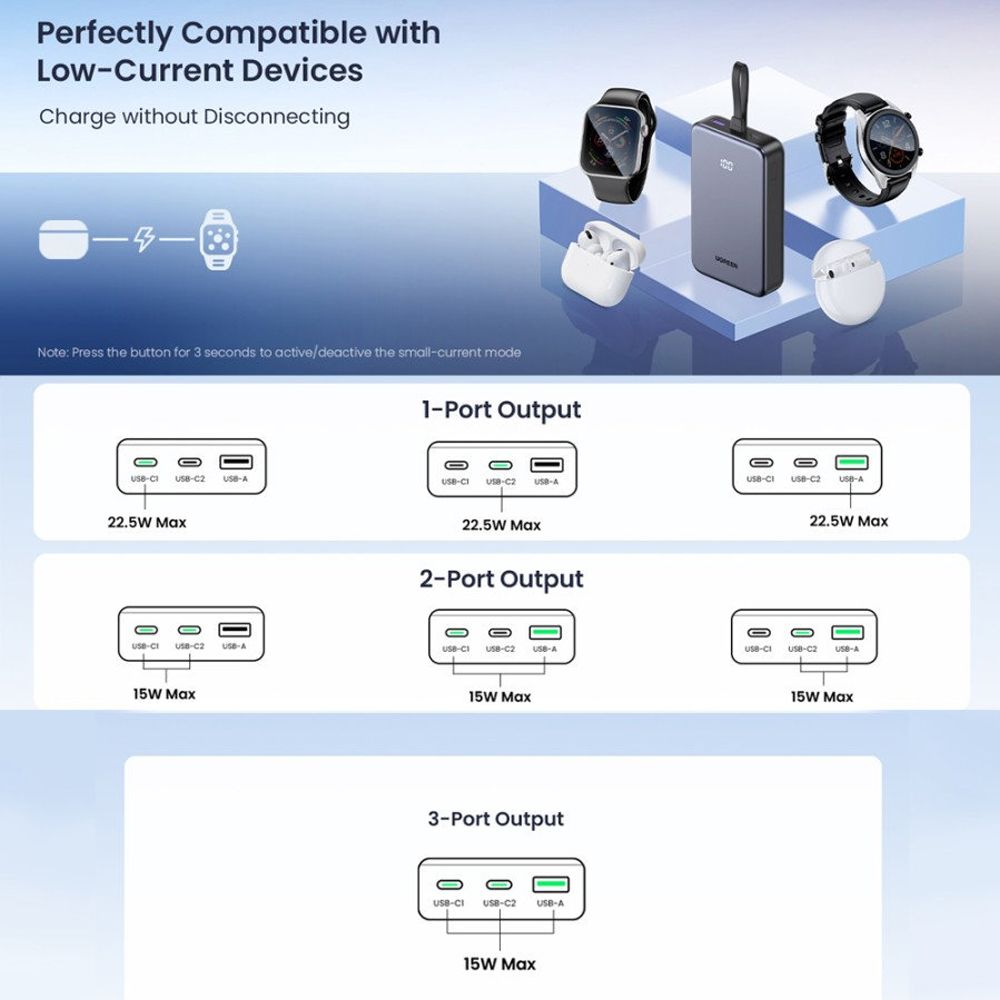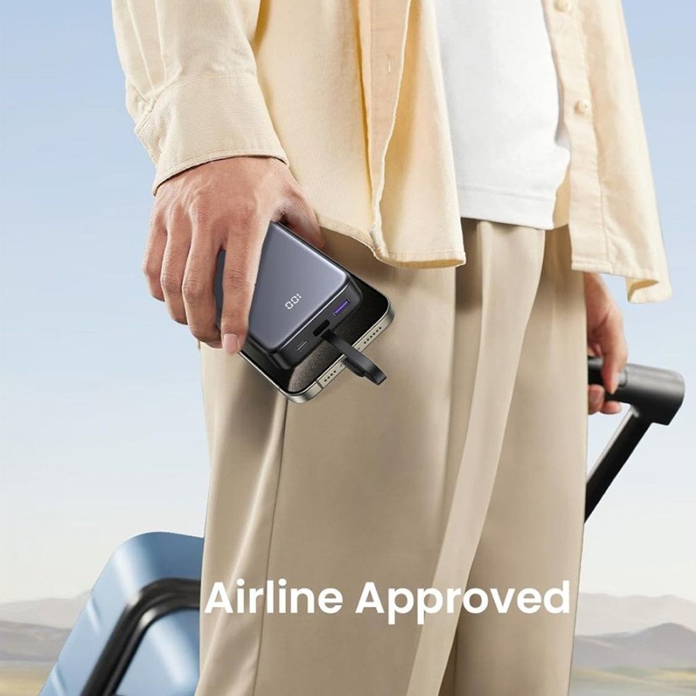 Bateria dispune de 2 porturi USB-C, 1 port USB-A si un cablu USB-C integrat, astfel incat poti incarca pana la 3 dispozitive simultan.