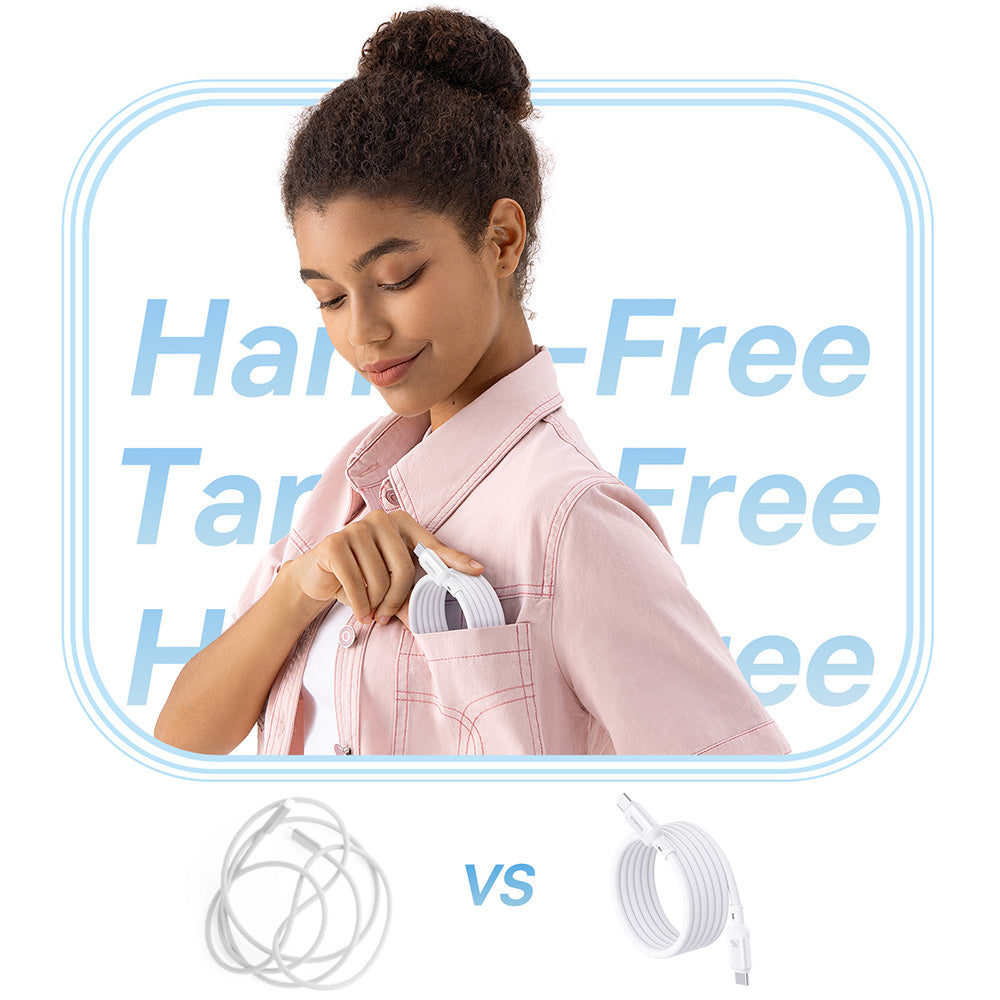 cablul se strange automat intr-o forma compacta si circulara, fiind perfect pentru transport si pastrarea ordinii in geanta sau pe birou. Construit din silicon si