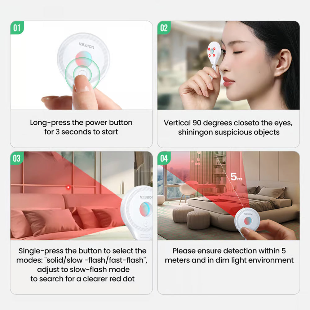 Detectorul Ugreen identifica rapid camerele spion si alte dispozitive de supraveghere ascunse, oferind siguranta in hoteluri sau spatii inchiriate.