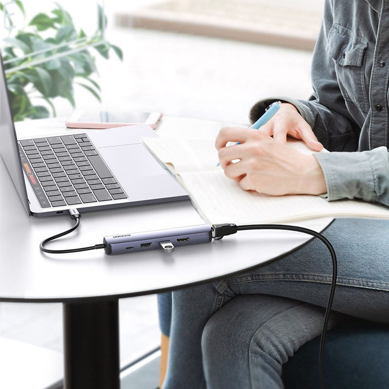 Hub-ul USB-C UGREEN CM418 iti transforma laptopul intr-o statie de lucru versatila, oferindu-ti conectivitate completa intr-un design compact si elegant.
