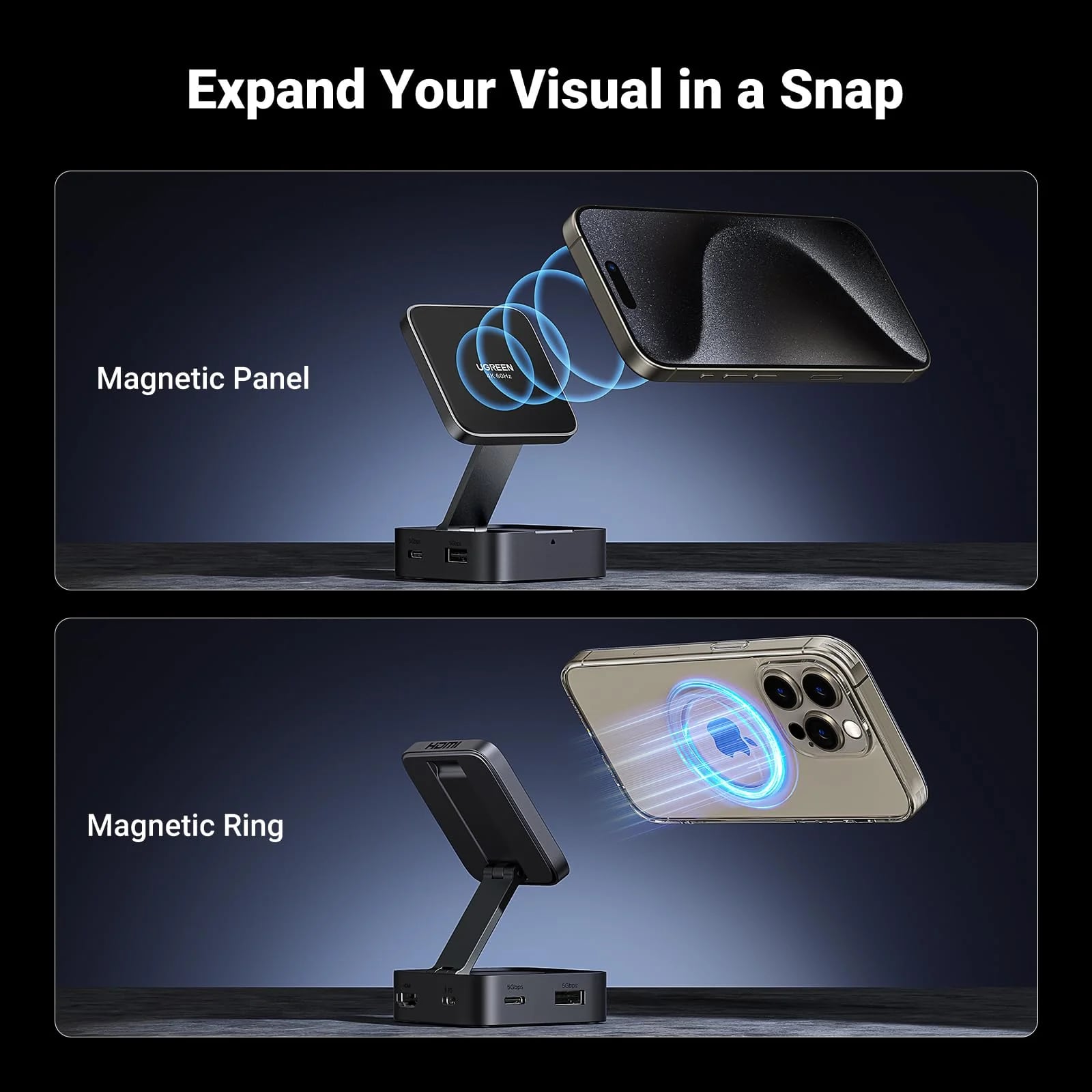 Echipat cu un sistem magnetic puternic de 9N si un inel magnetic dedicat, hub-ul se fixeaza ferm si sigur pe dispozitivele compatibile,