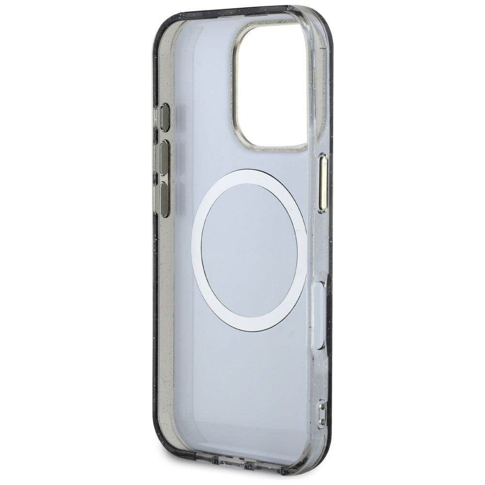 Husa MagSafe pentru Apple iPhone 16 Pro, Guess, IML Metal Glitter Flowers Triangle, Neagra