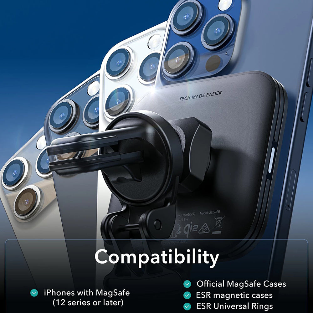 Halolock QI2 este, in acelasi timp, un suport stabil si un incarcator fara fir care poate fi montat in grila de ventilatie sau pe panoul de bord al masinii.