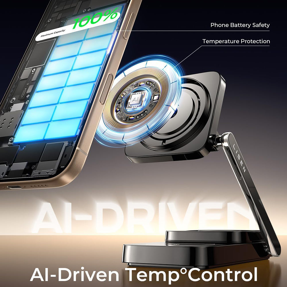 Aceasta statie premium marca Lisen este proiectata pentru a incarca simultan telefonul, ceasul si castile, eliminand nevoia de multiple adaptoare si cabluri.