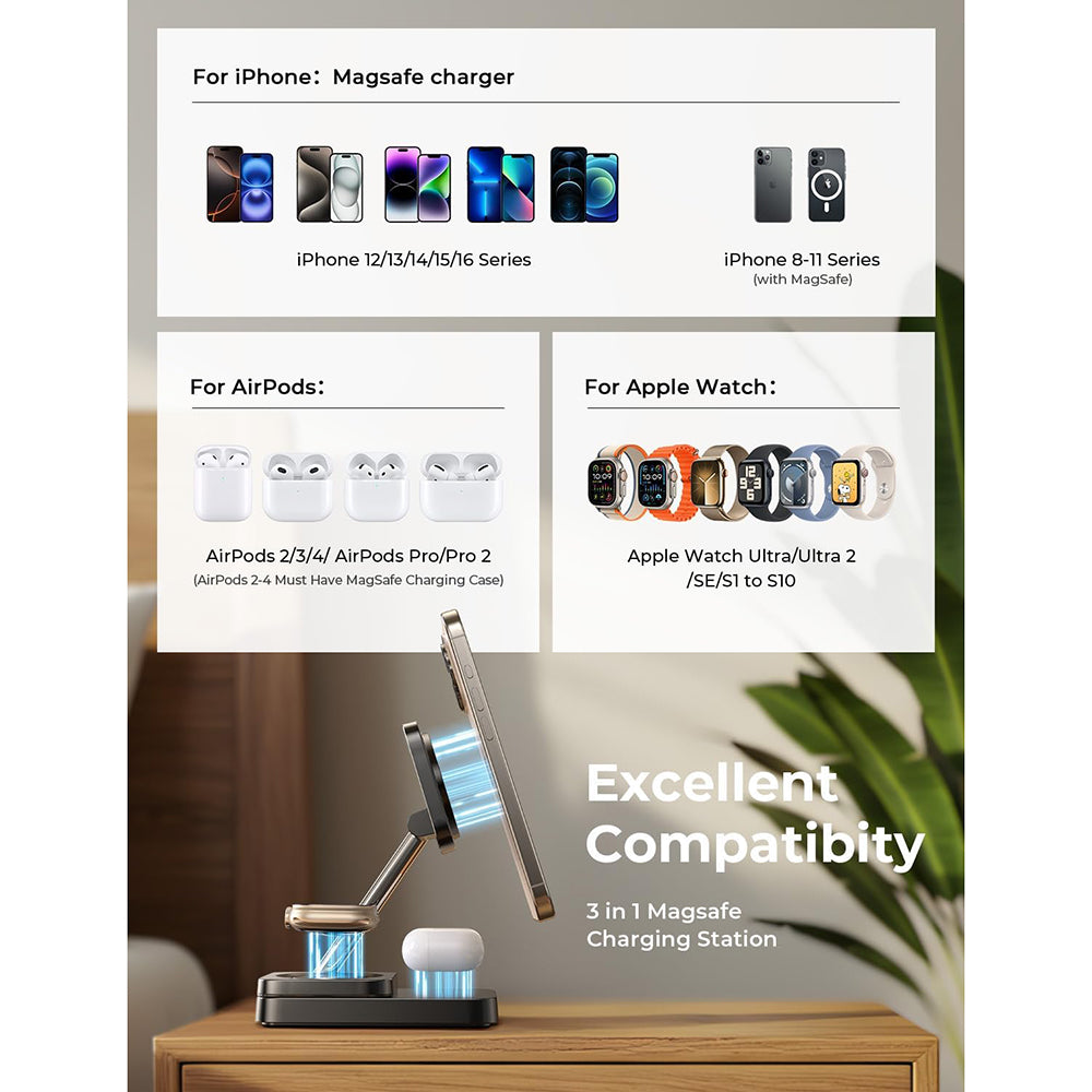 • Ideala pentru iPhone, Apple Watch si AirPods, statia ofera o solutie unificata de incarcare MagSafe, astfel incat fiecare dispozitiv sa se pozitioneze intuitiv si stabil pe modulul dedicat.