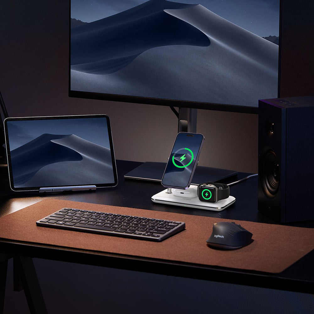 incarcare 3-in-1 care iti permite sa incarci simultan iPhone-ul, Apple Watch-ul si AirPods-urile, fara cabluri incurcate
