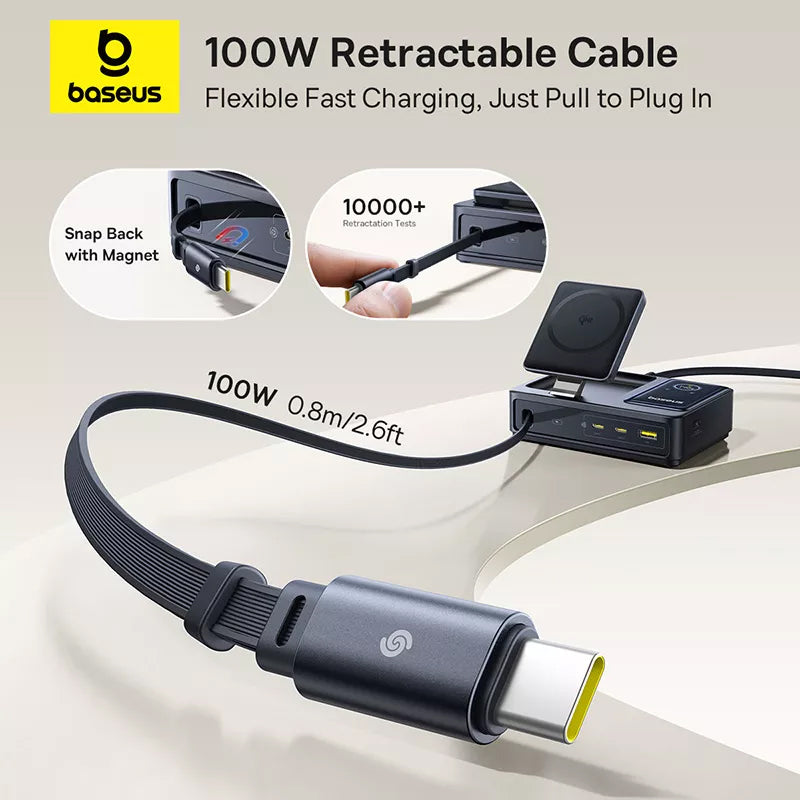 Cu un cablu USB-C retractabil de 100W, ofera nu doar o utilizare fara probleme, dar si o solutie convenabila pentru depozitare.