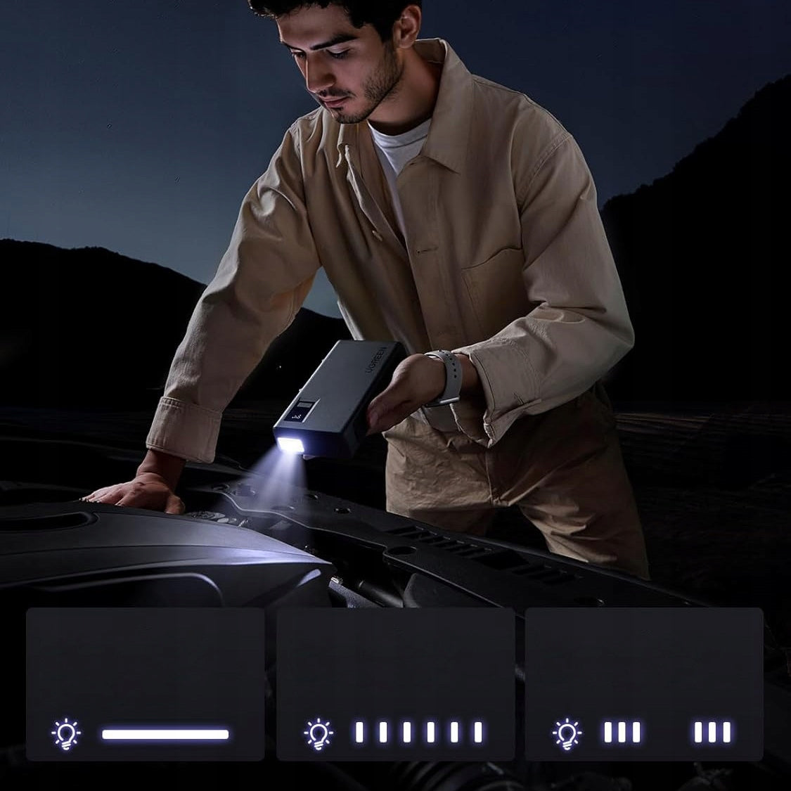 Ecranul digital integrat arata permanent nivelul de incarcare, iar lanterna LED cu trei moduri - iluminare standard,