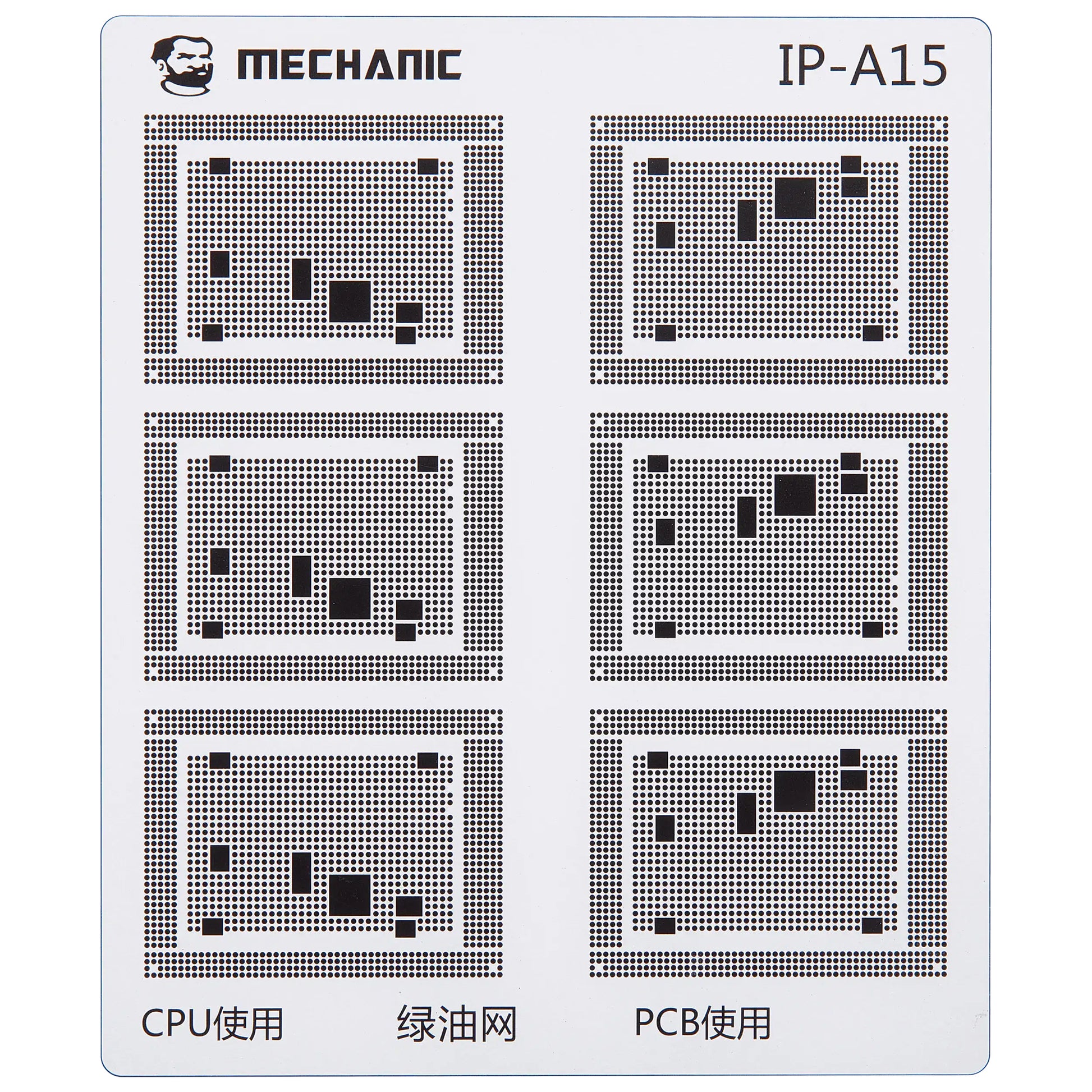 Acest sablon este conceput special pentru lucrul cu ulei verde (green oil) si acopera intreaga gama de procesoare Apple A8 pana la A18 Pro.