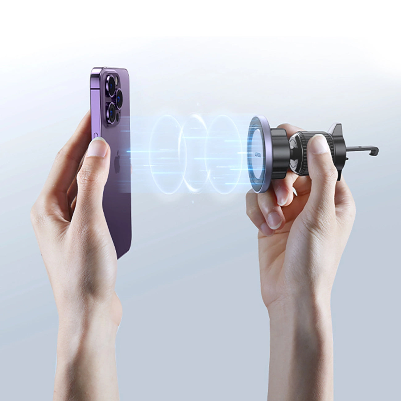 direct pe grila de ventilatie a masinii. Dotat cu magneti puternici, acest suport mentine telefonul ferm pe pozitie, chiar si atunci cand